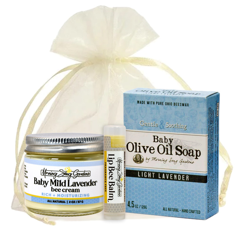 The perfect gift bag for baby showers. Complete with: Baby Olive Oil Soap, Light Lavender (4.5 oz. bar), "Little Calendula" Baby Bee Balm Cream (2 oz. jar), and Fragrance Free Lip Bee Balm (.2 oz. tube). Pure Ohio beeswax & extra virgin olive oil provide gentle moisture for diaper rash, dry skin and cradle cap. The mild and calming scent of lavender is ideal for all babies and for their fatigued parents!